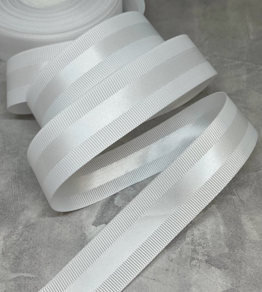 Репсова стрічка з атласною смугою 2,5 см, колір-білий, метр, Білий